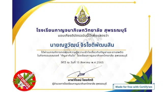 กิจกรรมตอบคำถาม “กัญชากันใจ” ผ่านสื่อออนไลน์ ผ่านเกณฑ์ 80% รับเกียรติบัตรทางอีเมล โดยโรงเรียนกาญจนาภิเษกวิทยาลัย สุพรรณบุรี