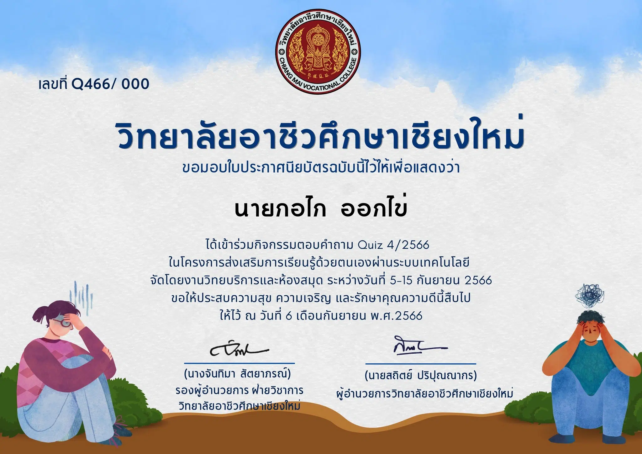 แบบทดสอบออนไลน์ กิจกรรมตอบคำถาม Quiz 4/2566 รับเกียรติบัตรฟรี โดยวิทยาลัยอาชีวศึกษาเชียงใหม่