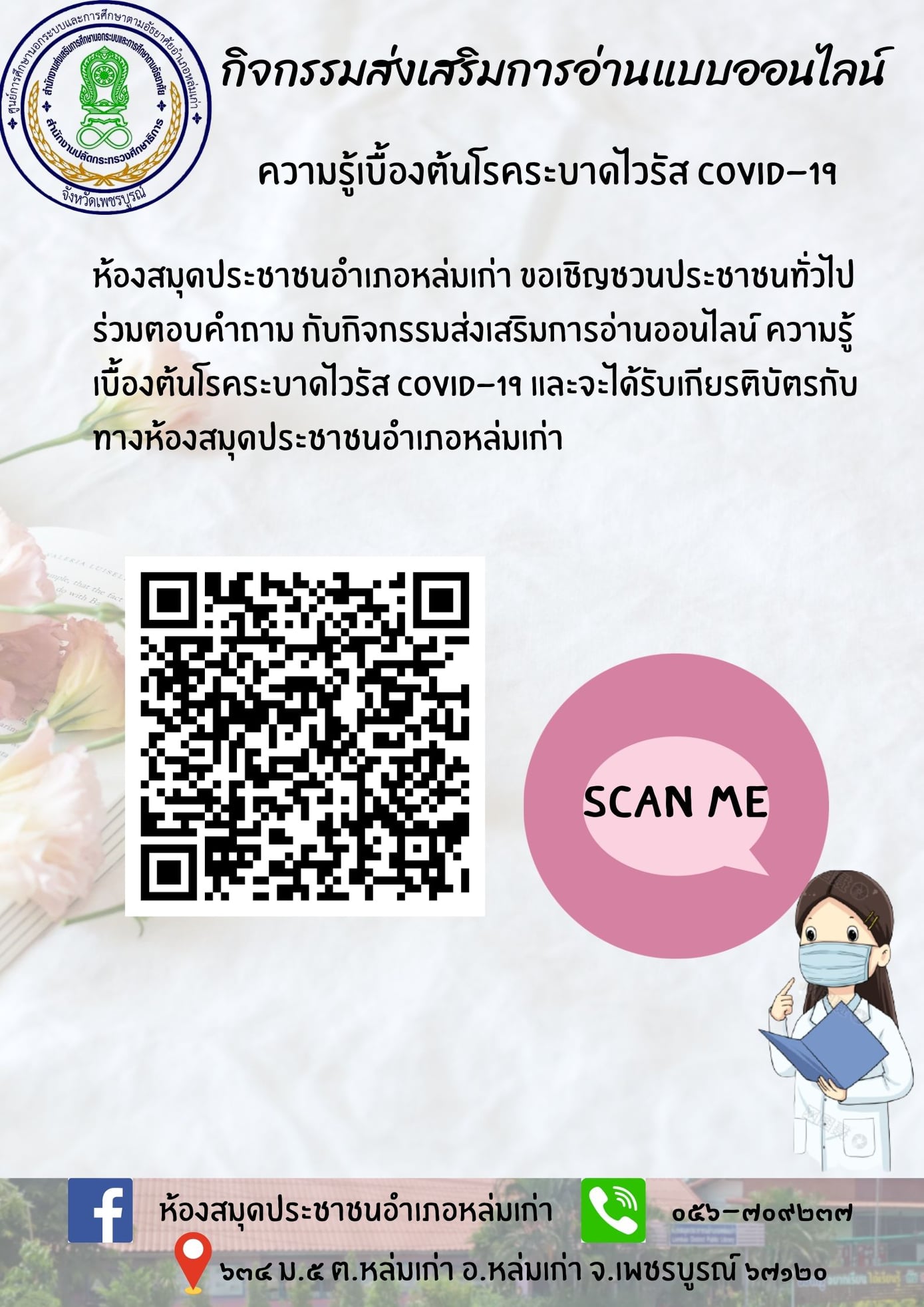 ห้องสมุดประชาชนอำเภอหล่มเก่า ขอเชิญชวนประชาชนทั่วไปร่วมตอบคำถาม กับกิจกรรมส่งเสริมการอ่านออนไลน์ ความรู้เบื้องต้นโรคระบาดไวรัส covid-19 และจะได้รับเกียรติบัตรกับทางห้องสมุดประชาชนอำเภอหล่มเก่า