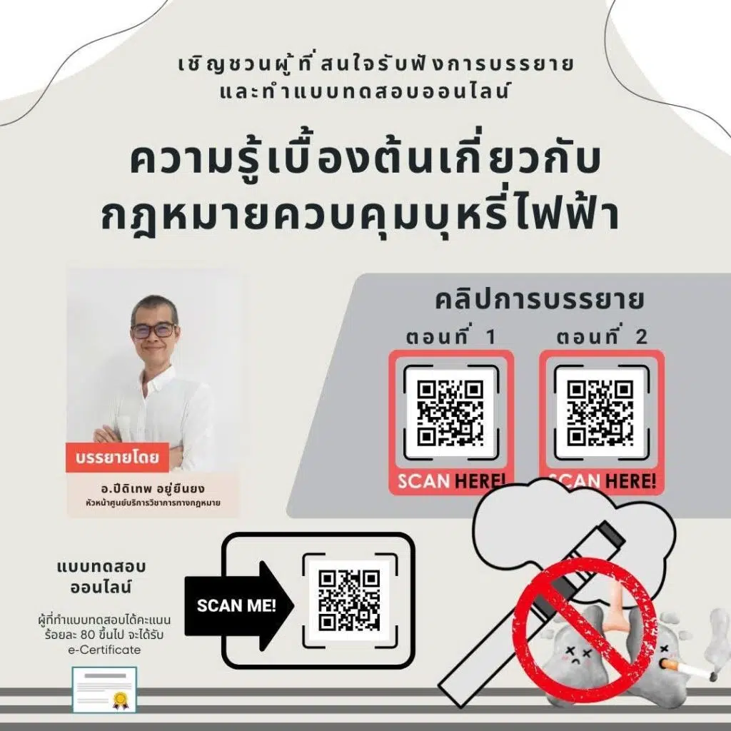 ขอเชิญชวนทุกท่านร่วมเรียนรู้และทำความเข้าใจเกี่ยวกับกฎหมายที่เกี่ยวข้องกับการควบคุมบุหรี่ไฟฟ้า ผ่านเกณฑ์ 80% รับเกียรติบัตรทางอีเมล โดยศูนย์บริการวิชาการทางกฎหมาย คณะนิติศาสตร์ มหาวิทยาลัยเชียงใหม่