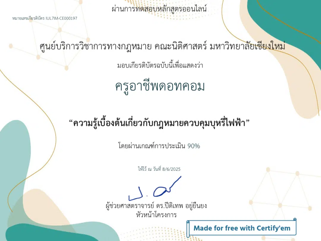 สำหรับผู้ที่ผ่านเกณฑ์ จะได้รับ เกียรติบัตรอิเล็กทรอนิกส์ (e-Certificate) 📜 จากคณะนิติศาสตร์ มหาวิทยาลัยเชียงใหม่ จัดส่งให้ทางอีเมลที่ท่านได้ลงทะเบียนไว้ 📧