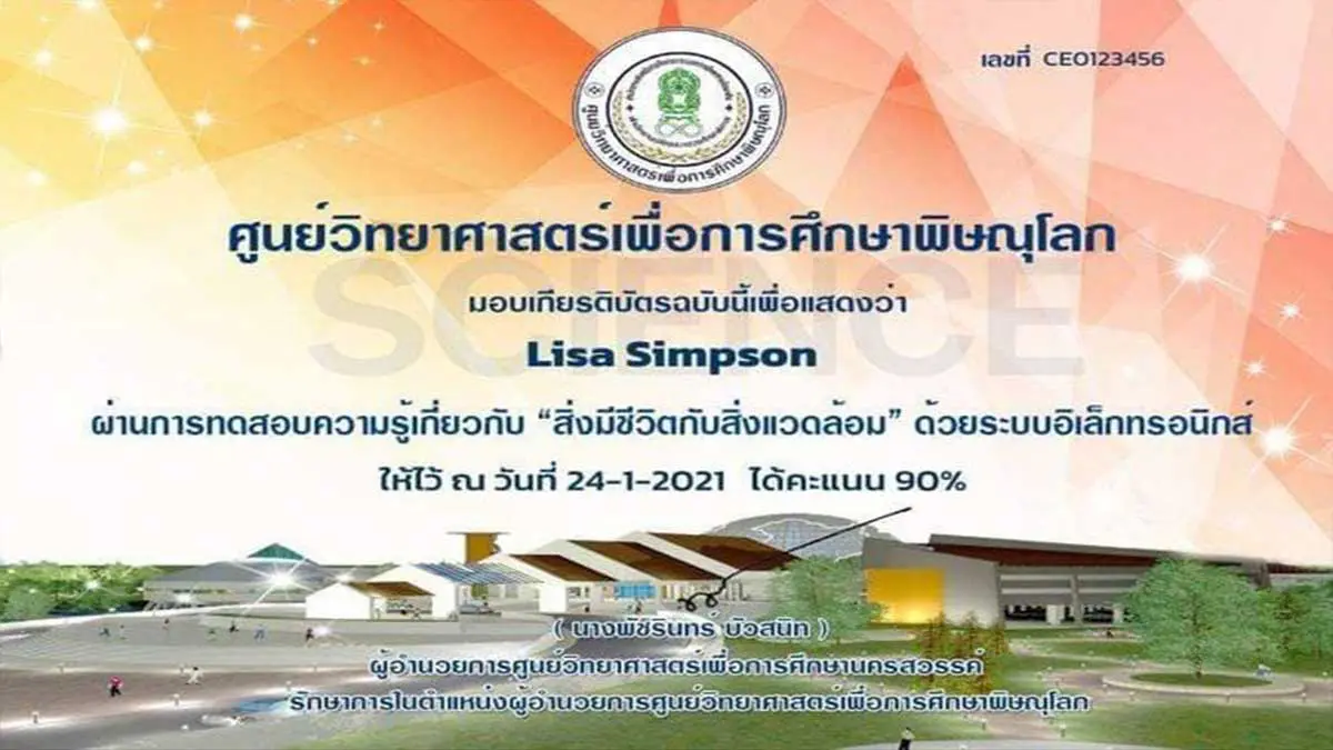 ขอเชิญทดสอบออนไลน์ เรื่อง “สิ่งมีชีวิตกับสิ่งแวดล้อม” ผ่านร้อยละ 80 ขึ้นไป รับเกียรติบัตรได้ที่ E-Mail ครูอาชีพดอทคอม ขอเชิญทุกท่านศึกษาความรู้จาก บทเรียน เรื่อง “สิ่งมีชีวิตกับสิ่งแวดล้อม” โดยศูนย์วิทยาศาสตร์เพื่อการศึกษาพิษณุโลก และร่วมทำแบบทดสอบออนไลน์ เมื่อตอบคำถามถูกร้อยละ 80 ขึ้นไป ถือว่าท่านผ่านเกณฑ์การทดสอบ โดยตรวจผลคะแนนได้ทันที และสามารถรอรับเกียรติบัตรได้ที่ E-Mail ที่ท่านได้ลงทะเบียนไว้