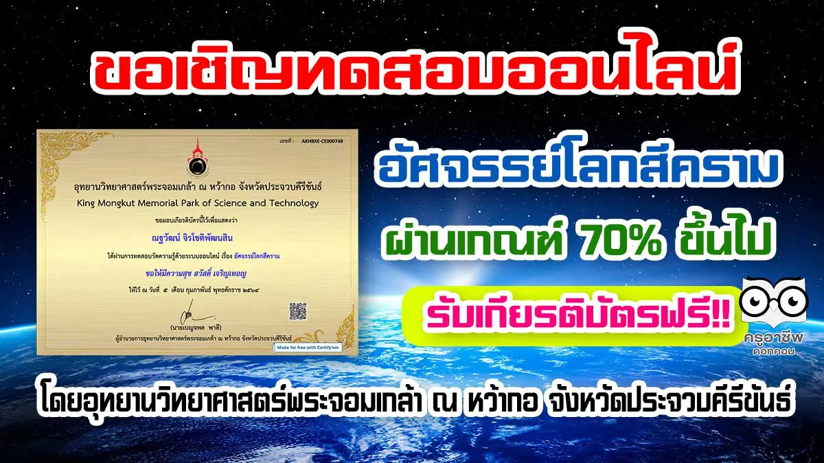 ขอเชิญทดสอบออนไลน์ เรื่อง อัศจรรย์โลกสีคราม ตอบคำถามถูกร้อยละ 70 ขึ้นไปรับเกียรติบัตร โดยอุทยานวิทยาศาสตร์พระจอมเกล้า ณ หว้ากอ จังหวัดประจวบคีรีขันธ์ แบบทดสอบวัดความรู้เกี่ยวกับ อัศจรรย์โลกสีคราม เนื้อหาประกอบไปด้วย