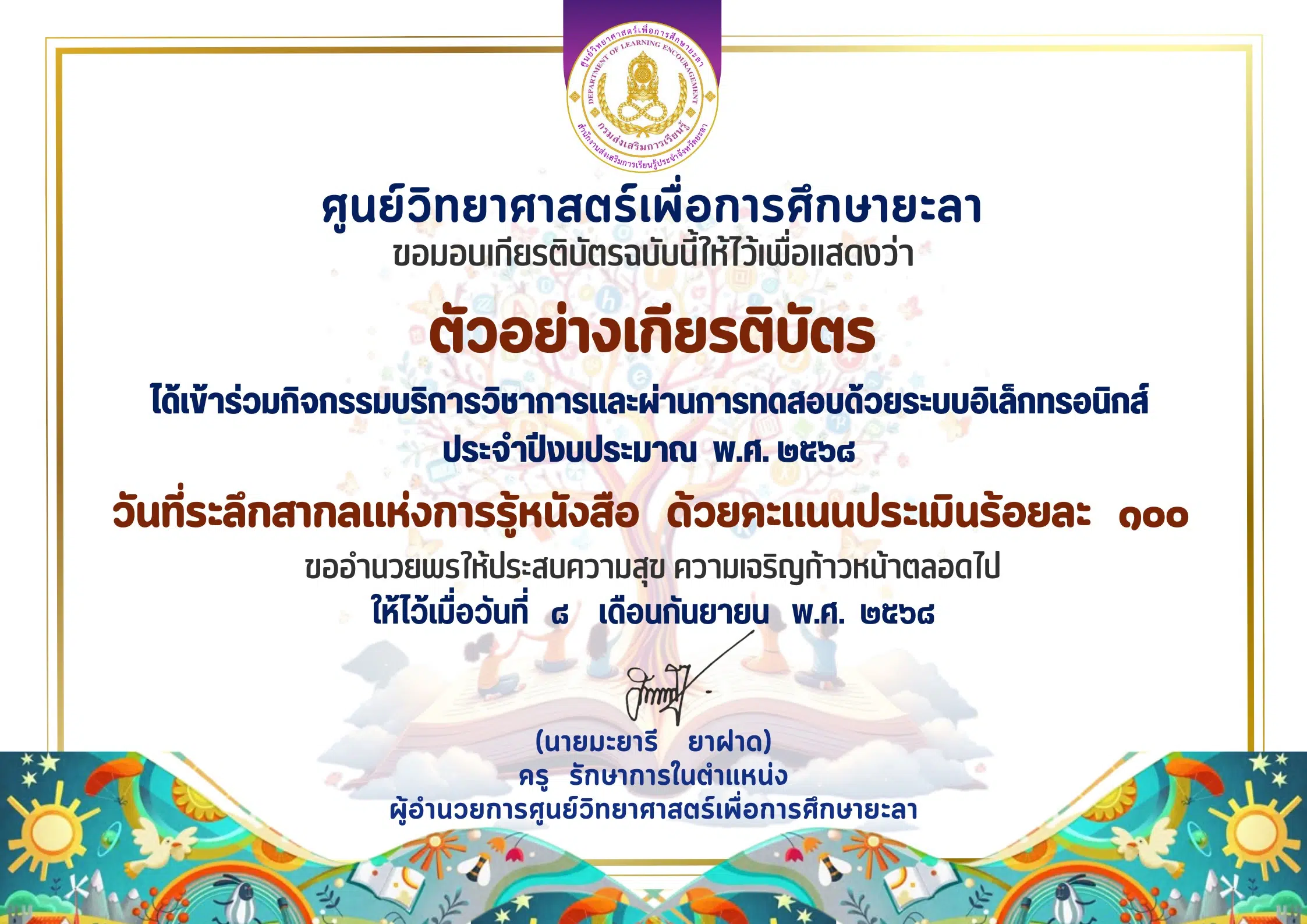 ขอเชิญทำแบบทดสอบออนไลน์ เรื่องวันที่ระลึกสากลแห่งการรู้หนังสือ 2568 รับเกียรติบัตรฟรี โดยศูนย์วิทยาศาสตร์เพื่อการศึกษายะลา