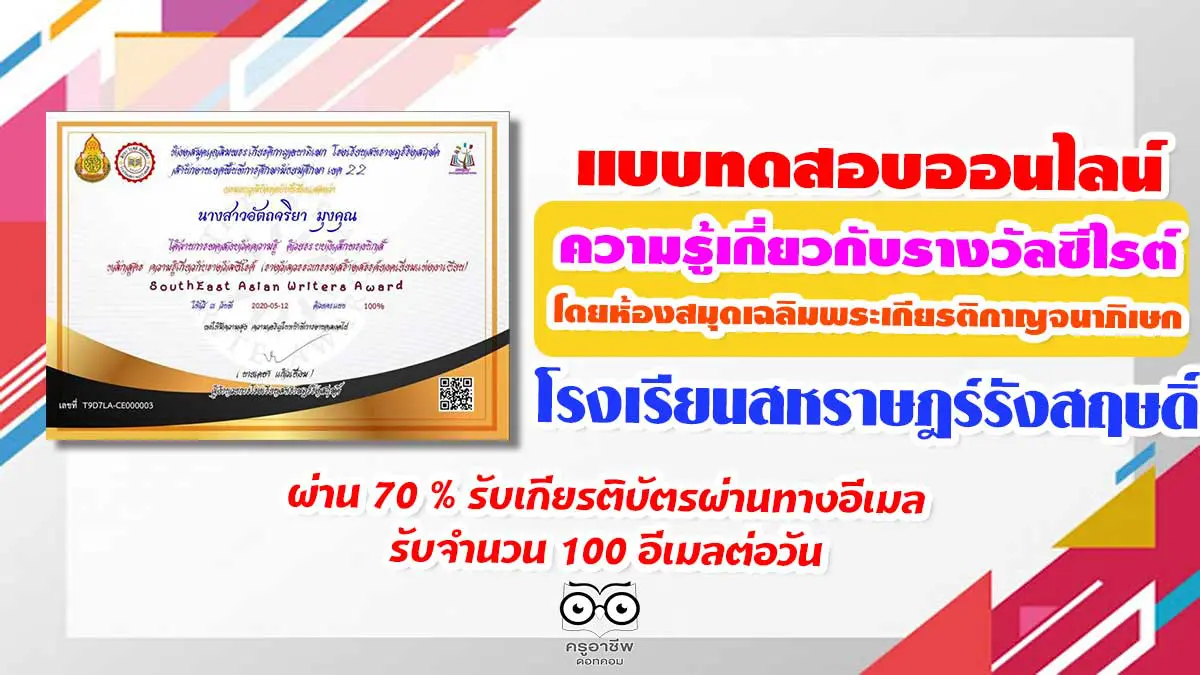 ห้องสมุดเฉลิมพระเกียรติกาญจนาภิเษก โรงเรียนสหราษฎร์รังสฤษดิ์ สำนักงานเขตพื้นที่การศึกษามัธยมศึกษา เขต 22 ขอเชิญชวนทำแบบทดสอบออนไลน์ หลักสูตรที่ 2 เรื่อง ความรู้เกี่ยวกับรางวัลซีไรต์ (รางวัลวรรณกรรมสร้างสรรค์ยอดเยี่ยมแห่งอาเซียน) ผ่าน 70 % รับเกียรติบัตรผ่านทางอีเมล รับจำนวน 100 อีเมลต่อวัน