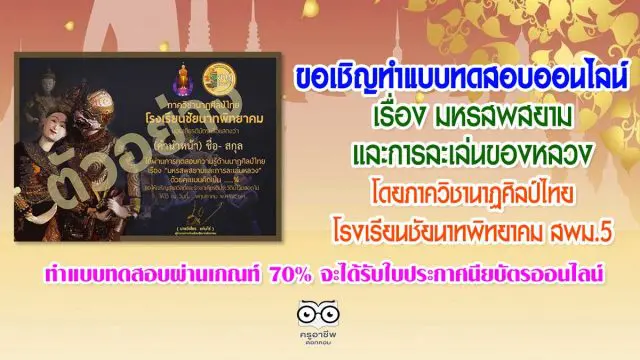 ขอเชิญทำแบบทดสอบออนไลน์ เรื่อง มหรสพสยามและการละเล่นของหลวง โดยภาควิชานาฏศิลป์ไทย กลุ่มสาระการเรียนรู้ศิลปศึกษา โรงเรียนชัยนาทพิทยาคม ทำแบบทดสอบผ่านเกณฑ์ 70% จะได้รับใบประกาศนียบัตรออนไลน์