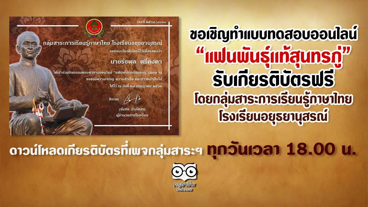 ขอเชิญทำแบบทดสอบออนไลน์ “แฟนพันธุ์เเท้สุนทรภู่” รับเกียรติบัตรฟรี โดยกลุ่มสาระการเรียนรู้ภาษาไทย โรงเรียนอยุธยานุสรณ์