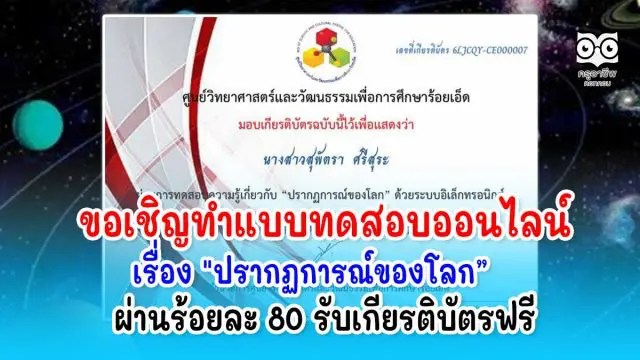 ขอเชิญทำแบบทดสอบออนไลน์ เรื่อง”ปรากฏการณ์ของโลก” ผ่านร้อยละ 80 ขึ้นไปรับเกียรติบัตรฟรี