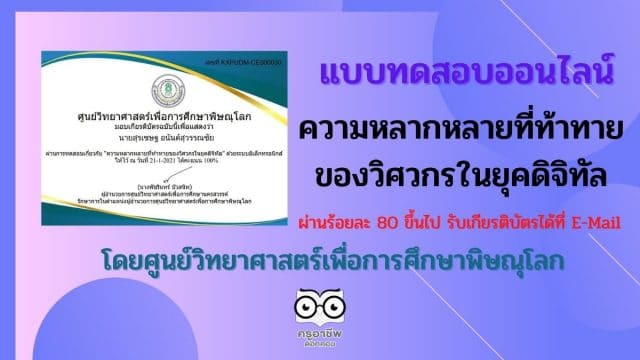 บทเรียน “ความหลากหลายที่ท้าทายของวิศวกรในยุคดิจิทัล” โดยศูนย์วิทยาศาสตร์เพื่อการศึกษาพิษณุโลก เมื่อตอบคำถามถูกร้อยละ 80 ขึ้นไป ถือว่าท่านผ่านเกณฑ์การทดสอบ โดยตรวจผลคะแนนได้ทันที และสามารถรอรับเกียรติบัตรได้ที่ E-Mail ที่ท่านได้ลงทะเบียนไว้