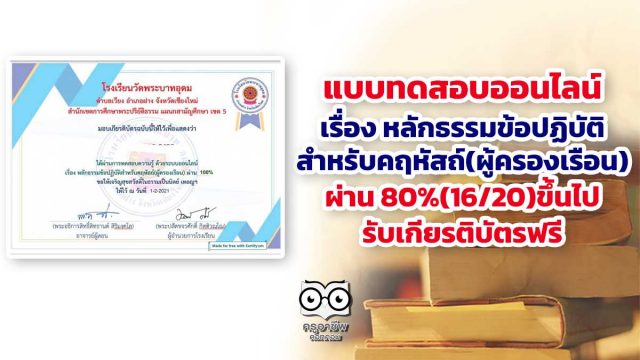 ขอเชิญทำแบบทดสอบออนไลน์ เรื่อง หลักธรรมข้อปฏิบัติสำหรับคฤหัสถ์(ผู้ครองเรือน) ผ่าน 80%(16/20)ขึ้นไป รับเกียรติบัตรฟรี โดยโรงเรียนวัดพระบาทอุดม ตำบลเวียง อำเภอฝาง จังหวัดเชียงใหม่ สำนักงานเขตการศึกษาพระปริยัติธรรม แผนกสามัญศึกษา เขต 5