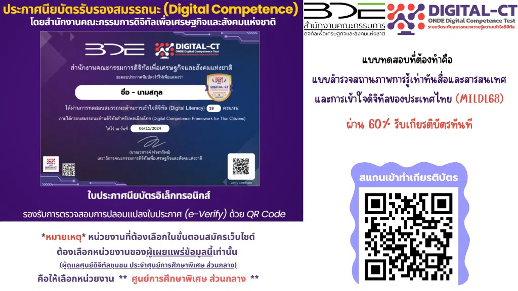 ซึ่งจะมีศูนย์ดิจิทัลชุมชนในพื้นที่ (ทั่วประเทศ) เป็นผู้อำนวยความสะดวกและให้คำแนะนำตลอดการทำแบบทดสอบ *(มีใบประกาศนียบัตรให้ เมื่อทำคะแนนผ่านเกณฑ์)