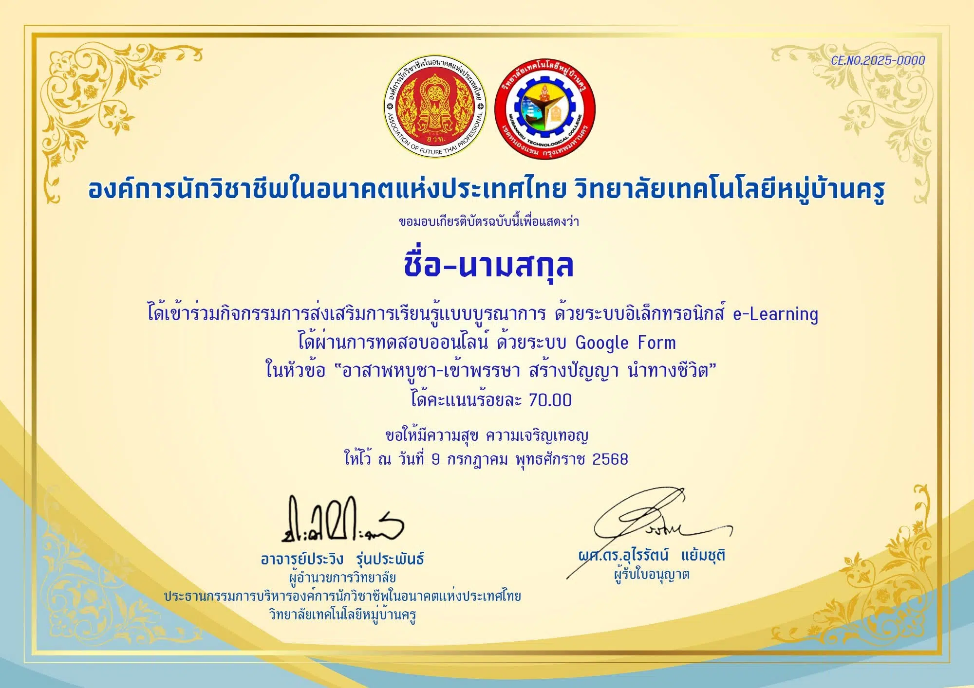 ผู้ที่ผ่านคะแนน ร้อยละ 70 ข้อขึ้นไปจะได้รับเกียรติบัตร โดย อทว.วิทยาลัยเทคโนโลยีหมู่บ้านครู