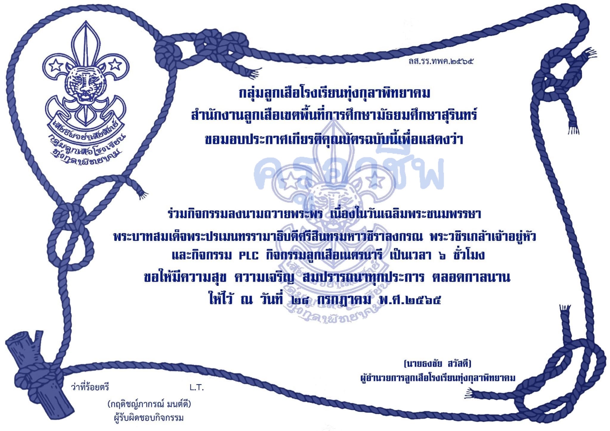 ขอเชิญร่วมกิจกรรมลงนามถวายพระพร ประมุขคณะลูกเสือแห่งชาติ รับเกียรติบัตรฟรีทางอีเมล โดยกลุ่มลูกเสือโรงเรียนทุ่งกุลาพิทยาคม
