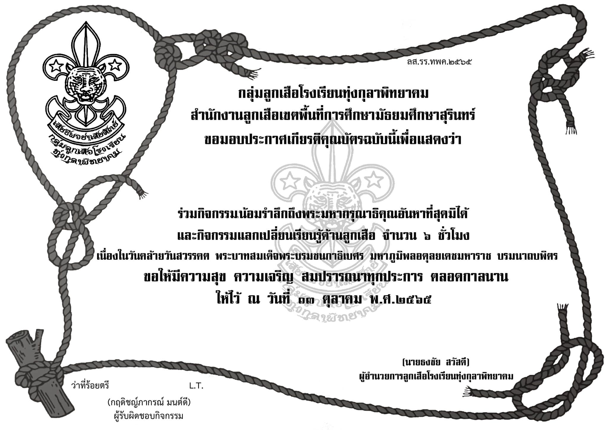 ขอเชิญร่วมกิจกรรมลูกเสือจิตอาสา รับเกียรติบัตรฟรี ทางอีเมล โดยโรงเรียนทุ่งกุลาพิทยาคม เนื่องในวันคล้ายวันสวรรคต พระบาทสมเด็จพระบรมชนกาธิเบศร มหาภูมิพลอดุลยเดชมหาราช บรมนาถบพิตร ปี 2565