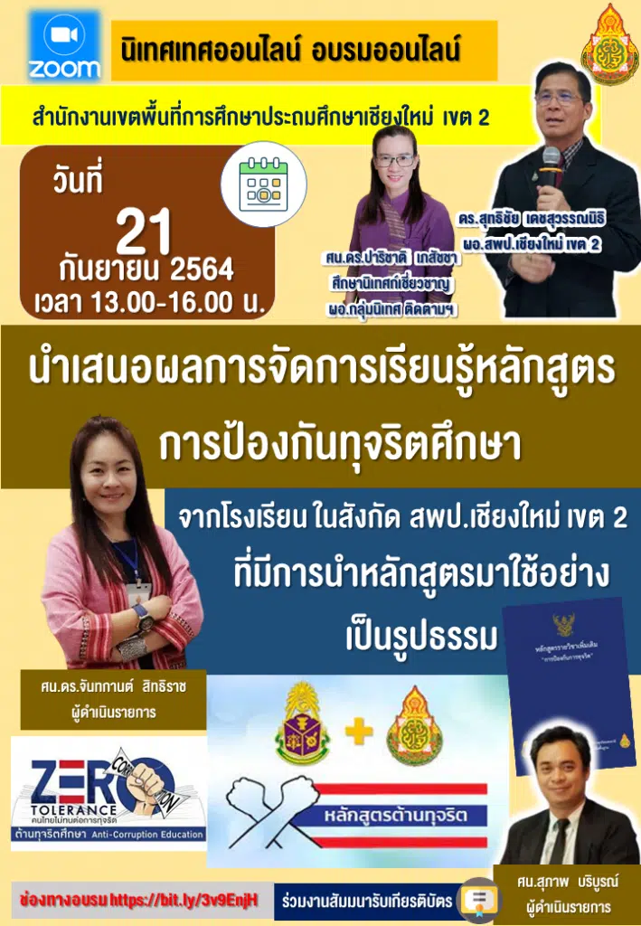 ลงทะเบียนรับเกียรติบัตรกิจกรรม นำเสนอการจัดการหลักสูตรป้องกันทุจริตศึกษา วันที่ 21 กันยายน 2564 เวลา 13.00 – 16.00 น. จัดโดย สพป.เชียงใหม่ เขต 2