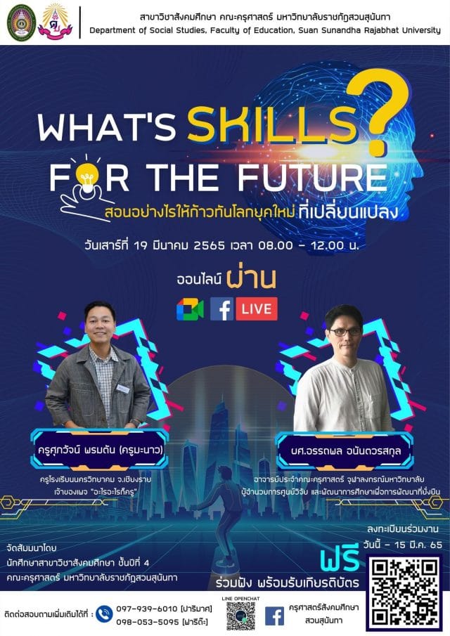 ขอเชิญร่วมสัมมนาพร้อมรับเกียรติบัตรฟรี หัวข้อ What’s Skills For The Future? สอนอย่างไรให้ก้าวทันโลกยุคใหม่ที่เปลี่ยนแปลง วันที่ 19 มีนาคม พ.ศ.2565 โดยสาขาวิชาสังคมศึกษา คณะครุศาสตร์ มหาวิทยาลัยราชภัฏสวนสุนันทา