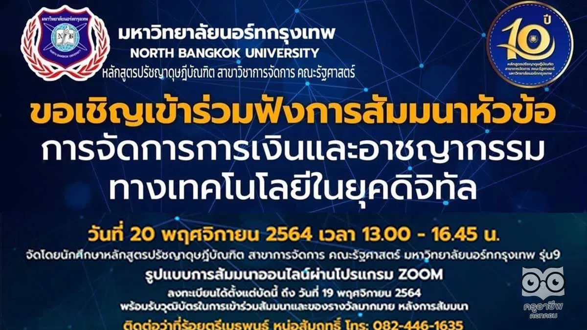 ขอเชิญร่วมสัมมนาออนไลน์ ฟรี!!! หัวข้อ การจัดการการเงินและอาชญากรรมทางเทคโนโลยีในยุดดิจิทัล พร้อมวุฒิบัตร วันเสาร์ที่ 20 พ.ย.2564 เวลา 13.00-16.30น. โดยคณะรัฐศาสตร์ มหาวิทยาลัยนอร์ทกรุงเทพ