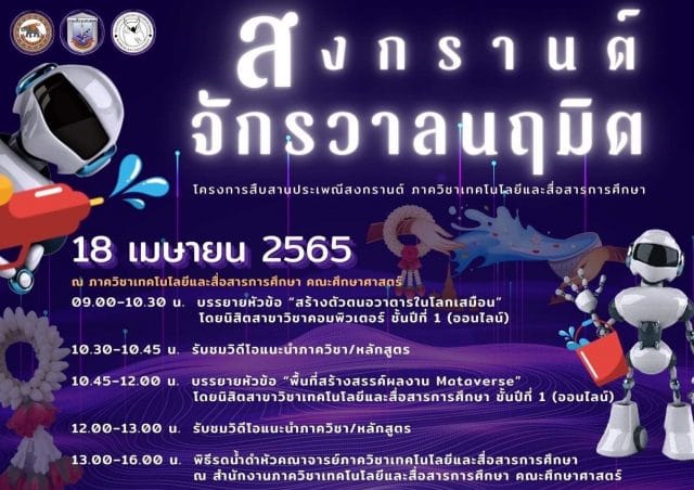 ขอเชิญลงทะเบียนกิจกรรมสงกรานต์จักรวาลนฤมิต วันที่ 18 เมษายน 2565 เวลา 09.00-16.00 น. รับเกียรติบัตรฟรี โดยภาควิชาเทคโนโลยีและสื่อสารการศึกษา ม.นเรศวร