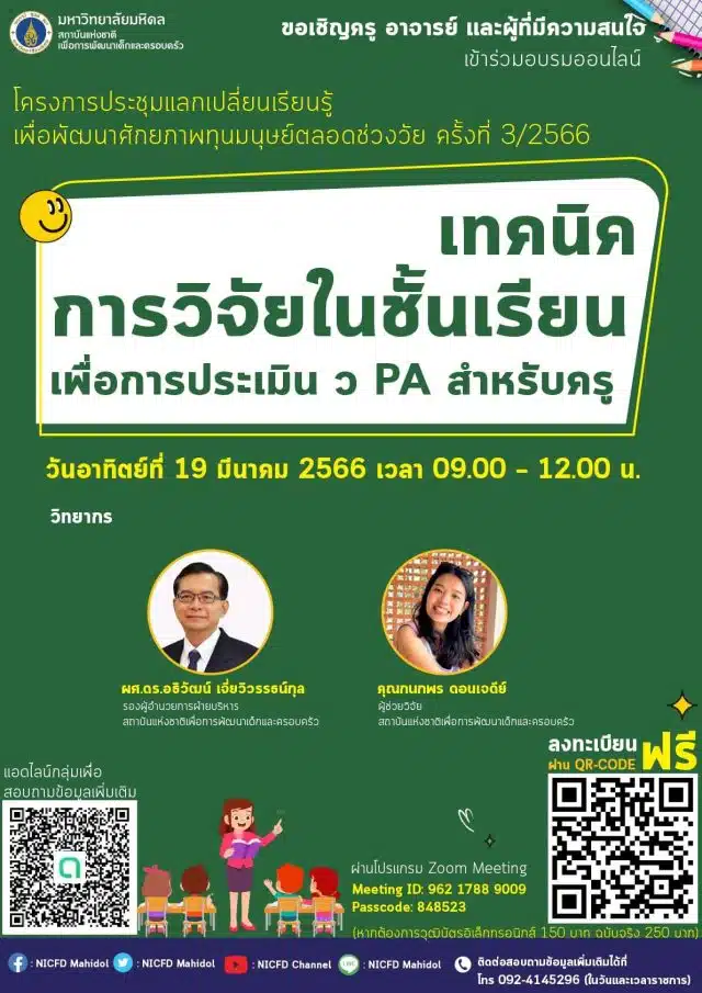 ขอเชิญลงทะเบียนอบรมออนไลน์ฟรี ในหัวข้อ “เทคนิคการวิจัยในชั้นเรียน เพื่อการประเมิน ว PA สำหรับครู” วันที่ 19 มีนาคม 2566 โดยมหาวิทยาลัยมหิดล
