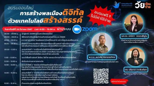 ขอเชิญชวนบุคลากรทางการศึกษา บุคคลทั่วไป และ ผู้สนใจ เข้าร่วมการอบรมออนไลน์ “การสร้างพลเมืองดิจิตัลด้วยเทคโนโลยี สร้างสรรค์”