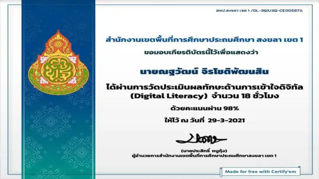 อบรมออนไลน์ ฟรี หลักสูตร การวัดประเมินผลทักษะด้านการเข้าใจดิจิทัล (DIGITAL LITERACY) จาก สำนักงานเขตพื้นที่การศึกษาประถมศึกษาสงขลา เขต 1 จัดทำโดย นายนุห์กานต์ เอสเอ ตำแหน่ง ศึกษานิเทศก์