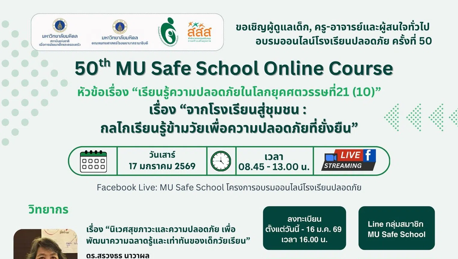 ขอเชิญอบรมออนไลน์โรงเรียนปลอดภัย ครั้งที่ 50 จากโรงเรียนสู่ชุมชน : กลไกเรียนรู้ข้ามวัยเพื่อความปลอดภัยที่ยั่งยืน วันเสาร์ที่ 17 มกราคม 2569 รับเกียรติบัตรฟรี จากมหาวิทยาลัยมหิดล