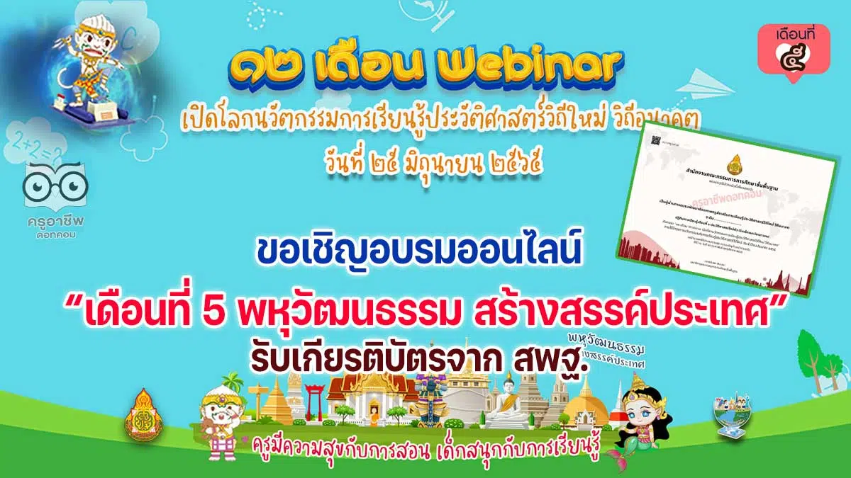 ขอเชิญอบรมออนไลน์ รับเกียรติบัตร สพฐ. กิจกรรมอบรม 12 เดือน Webinar เปิดโลกนวัตกรรมการเรียนรู้ประวัติศาสตร์วิถีใหม่ วิถีอนาคต เพื่อรับวุฒิบัตรฟรี เดือนที่ 5 พหุวัฒนธรรม สร้างสรรค์ประเทศ วันที่ 25 มิถุนายน 2565