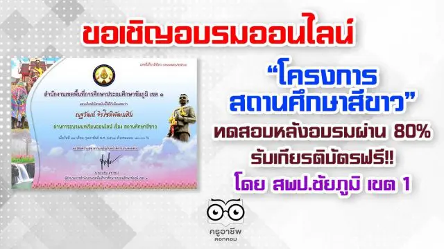 ขอเชิญอบรมออนไลน์ หลักสูตรสถานศึกษาสีขาว ทดสอบหลังอบรมผ่าน 80% รับเกียรติบัตรฟรี!! โดย สพป.ชัยภูมิ เขต 1