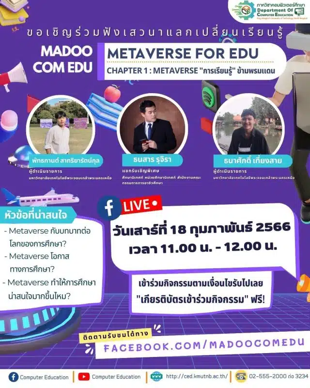 ขอเชิญอบรมออนไลน์ Metaverse กับการศึกษาไปด้วยกันได้หรือไม่? วันเสาร์ที่ 18 กุมภาพันธ์ 2566 เวลา 11.00-12.00 น. มีเกียรติบัตรฟรี จากภาควิชาคอมพิวเตอร์ มจพ.