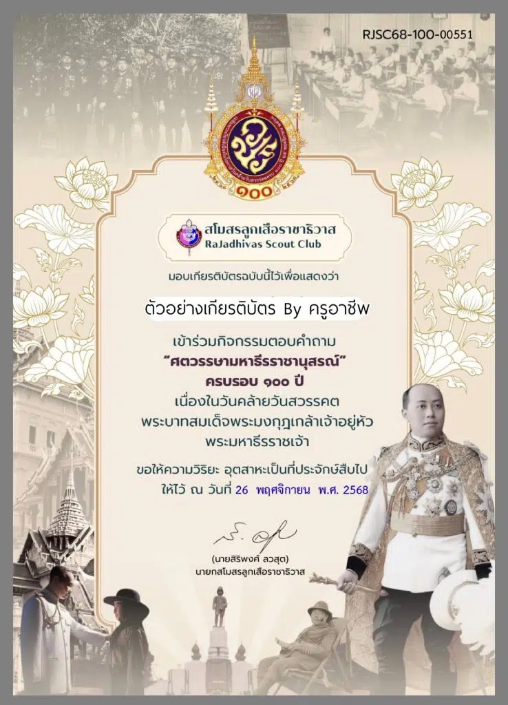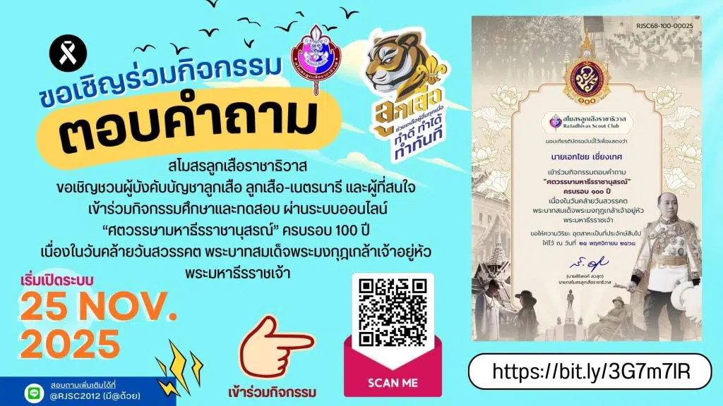 แบบทดสอบออนไลน์ “ศตวรรษามหาธีรราชานุสรณ์” ครบรอบ 100 ปี เนื่องในวันคล้ายวันสวรรคต พระบาทสมเด็จพระมงกุฎเกล้าเจ้าอยู่หัว ผ่านเกณฑ์ 60% รับเกียรติบัตรจากสโมสรลูกเสือราชาธิวาส