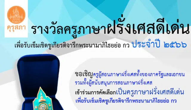 คุรุสภาประกาศคัดเลือกครูภาษาฝรั่งเศสดีเด่น เพื่อรับรางวัลเข็มเชิดชูเกียรติจารึกพระนามาภิไธยย่อ กว ประจำปี 2566 ขอเชิญครูผู้สอนภาษาฝรั่งเศสทั้งของภาครัฐและเอกชน รวมทั้งผู้สนับสนุนการสอนภาษาฝรั่งเศส เข้าร่วมการคัดเลือกเป็นครูภาษา ฝรั่งเศสดีเด่น ประจำปี 2566 เพื่อรับเข็มเชิดชูเกียรติจารึกพระนามาภิไธยย่อ กว