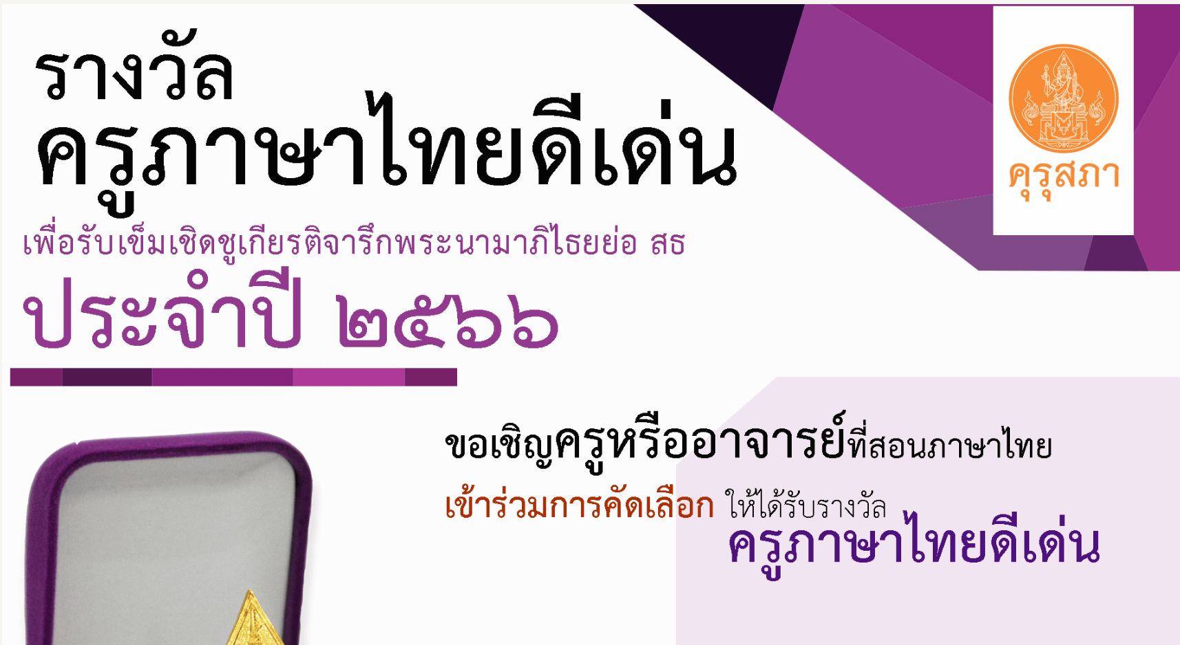 คุรุสภาประกาศคัดเลือกครูภาษาไทยดีเด่น เพื่อรับรางวัลเข็มเชิดชูเกียรติจารึกพระนามาภิไธยย่อ สธ ประจำปี 2566 ส่งผลงานภายใน 31 มีนาคม 2566