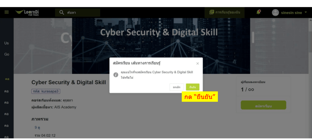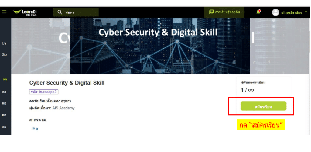 4.คลิกลิงก์หลักสูตรที่ต้องการสมัครเรียนอีกครั้ง คลิกปุ่ม “สมัครเรียน”