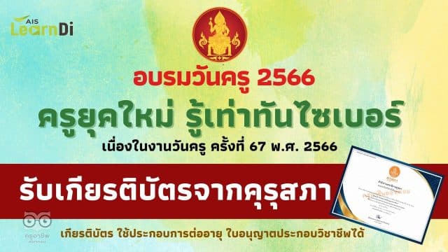 อบรมออนไลน์ฟรี หลักสูตร Cyber Wellness ครูยุคใหม่ รู้เท่าทันไซเบอร์ เนื่องในวันครู 2566 รับเกียรติบัตรจากคุรุสภา อบรมผ่านแพลตฟอร์มเลิร์นดิ