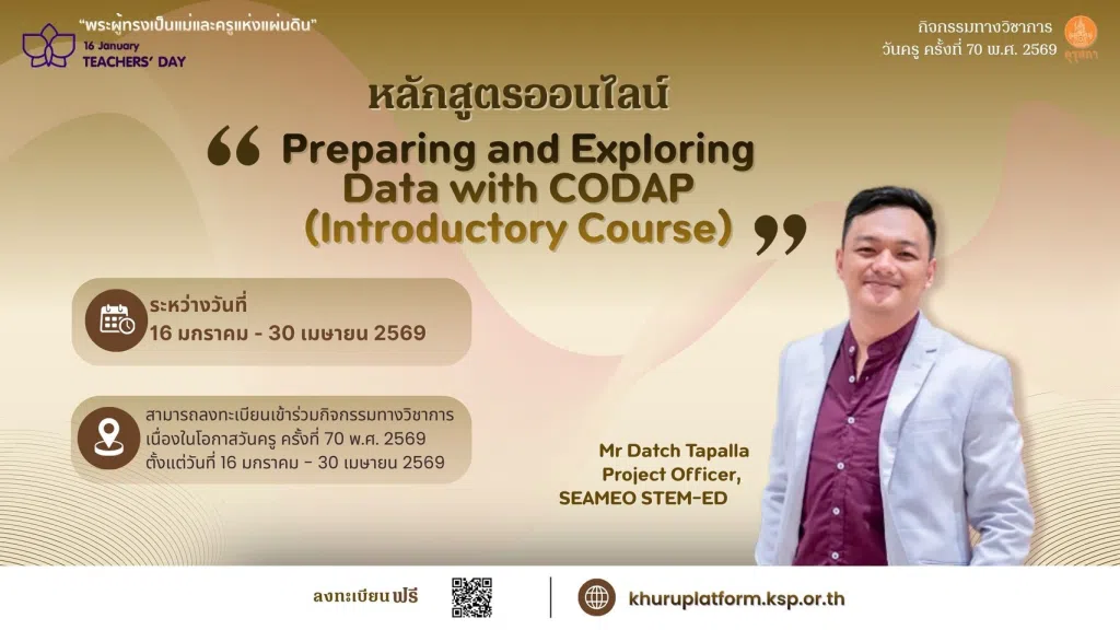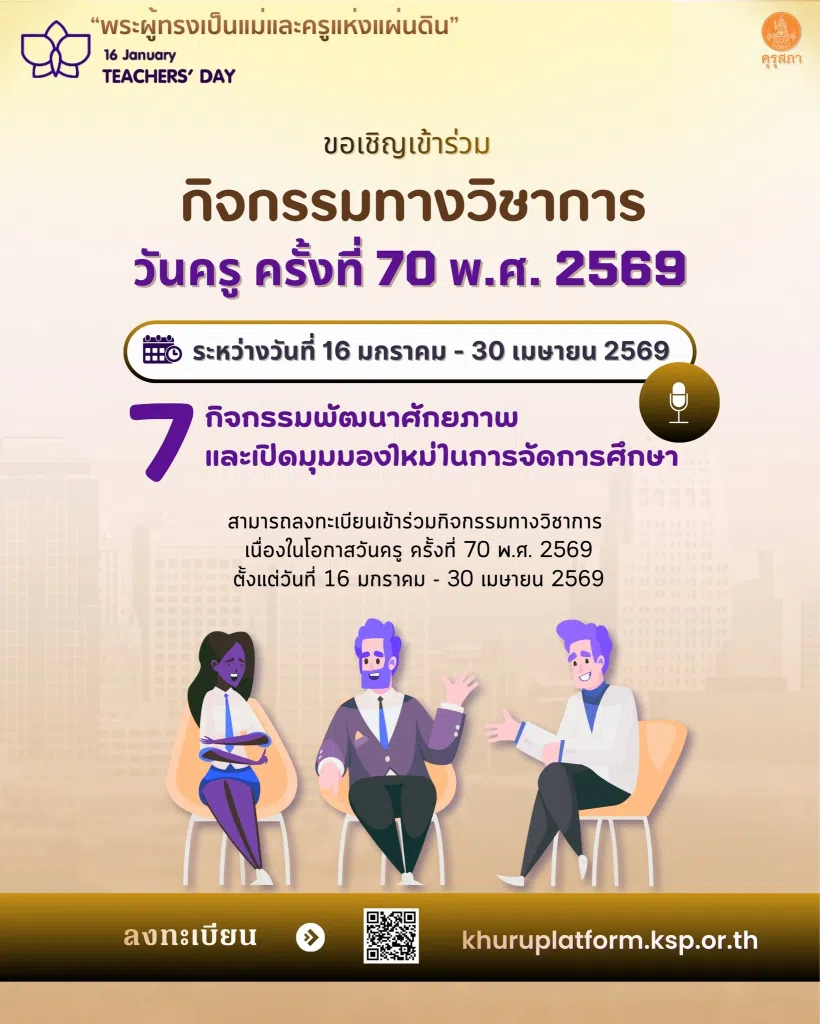 กิจกรรมวิชาการเนื่องในโอกาสงานวันครู ครั้งที่ 70 พ.ศ. 2569 “พระผู้ทรงเป็นแม่และครูแห่งแผ่นดิน” ขอเชิญชวนคุณครู ผู้บริหาร บุคลากรทางการศึกษา และผู้สนใจทุกท่าน เข้าร่วมกิจกรรมทางวิชาการผ่านระบบออนไลน์ เพื่อพัฒนาศักยภาพและเปิดมุมมองใหม่ในการจัดการศึกษา
