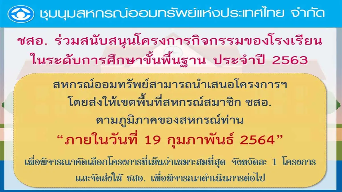 ชุมนุมสหกรณ์ออมทรัพย์ฯ เปิดรับข้อเสนอโครงการ เพื่อรับเงินสนับสนุนโรงเรียนประจำปี 2563 ภายใน 19 กุมภาพันธ์ 2564 โดยจะให้ความสำคัญกับโรงเรียนที่มีการดำเนินกิจกรรมสหกรณ์ โครงการละ 15,000 บาท