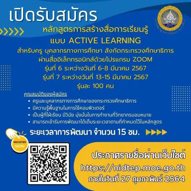 ประกาศเปิดรับสมัคร ผู้เข้ารับการพัฒนาโครงการพัฒนาครูและบุคลากรทางการศึกษาสู่ทักษะแห่งอนาคต : หลักสูตรการสร้างสื่อการเรียนรู้แบบ Active learning สำหรับครูและบุคลากรทางการศึกษา สังกัดกระทรวงศึกษาธิการ ผ่านสื่ออิเล็กทรอนิกส์ด้วยโกรม Zoom (ออนไลน์)