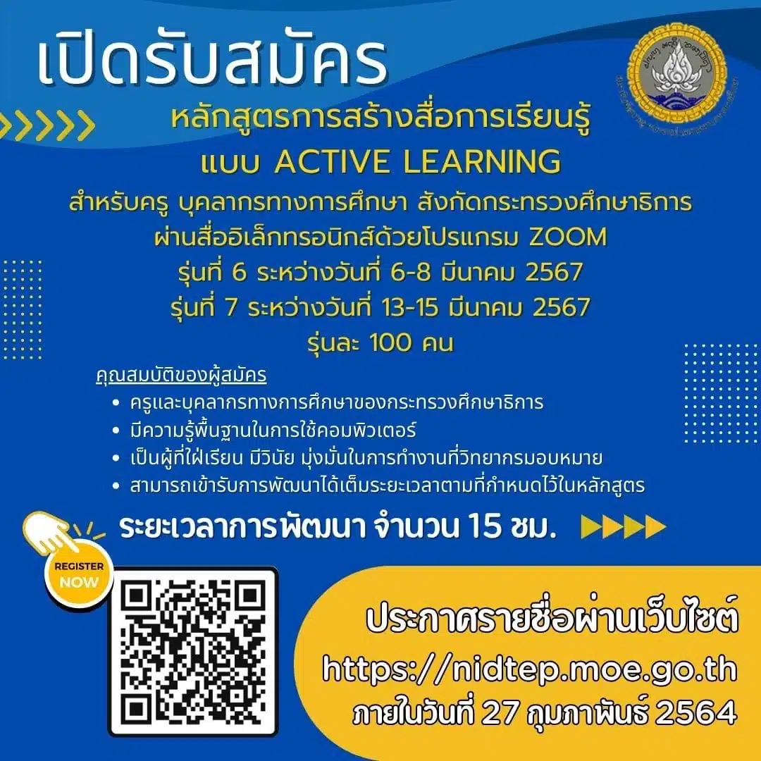 ด่วนก่อนเต็ม ลงทะเบียนอบรม หลักสูตรการสร้างสื่อการเรียนรู้แบบ Active learning รุ่นที่ 6-7 รับเกียรติบัตรจาก สถาบันพัฒนาครู คณาจารย์ และบุคลากรทางการศึกษา (สคบศ.)