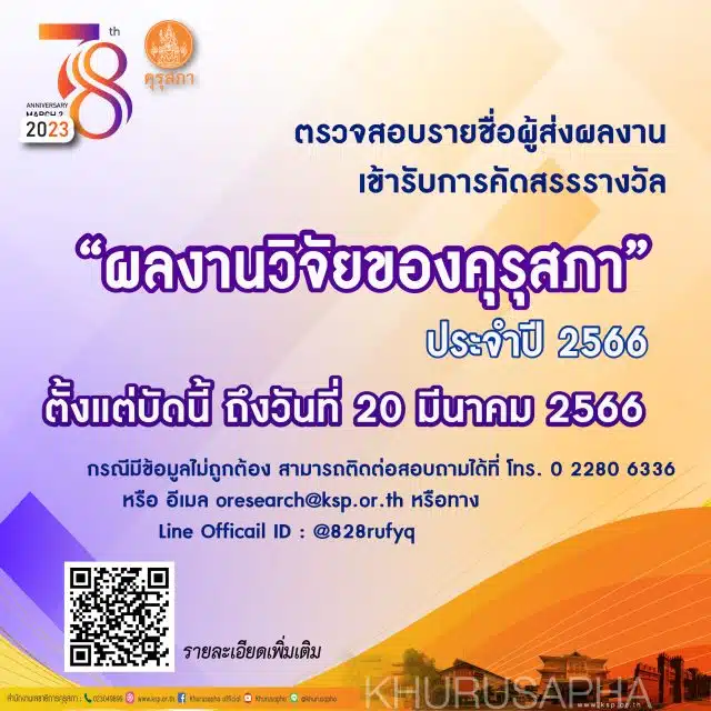 กรณีข้อมูลไม่ถูกต้อง สามารถติดต่อสอบถามได้ที่ สำนักพัฒนาและส่งเสริมวิชาชีพ กลุ่มพัฒนาวิชาชีพ โทร. 0 2280 6336 หรือ e-mail: research@ksp.or.th หรือทาง Line Officail ID : @828rufyq