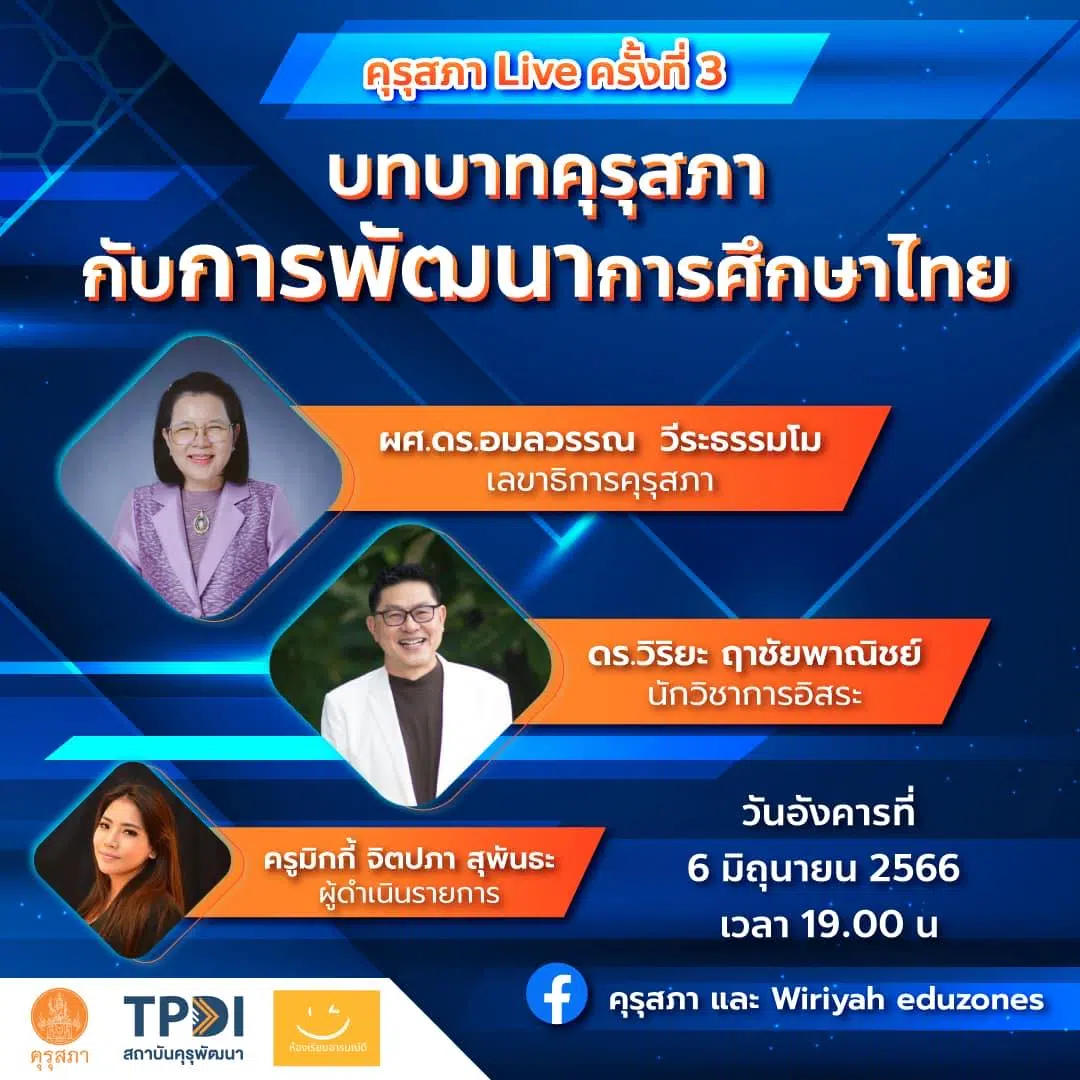ขอเชิญรับชม คุรุสภา Live ครั้งที่ 3 บทบาทคุรุสภากับการพัฒนาการศึกษาไทย วันที่ 6 มิถุนายน 2566 เวลา 19.00 น. โดยคุรุสภา และ Wiriyah eduzones