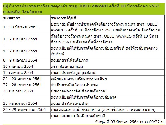 ปฏิทินการประกวดรางวัลทรงคุณค่า สพฐ. OBEC AWARD ครั้งที่ 10 ปีการศึกษา 2563 ภาคเหนือ จังหวัดน่าน