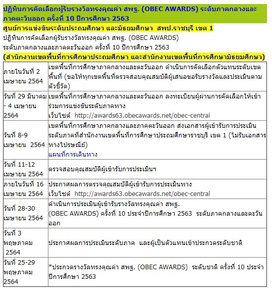 ปฏิทินการคัดเลือกผู้รับรางวัลทรงคุณค่า สพฐ. (OBEC AWARDS) ระดับภาคกลางและภาคตะวันออก ครั้งที่ 10 ปีการศึกษา 2563