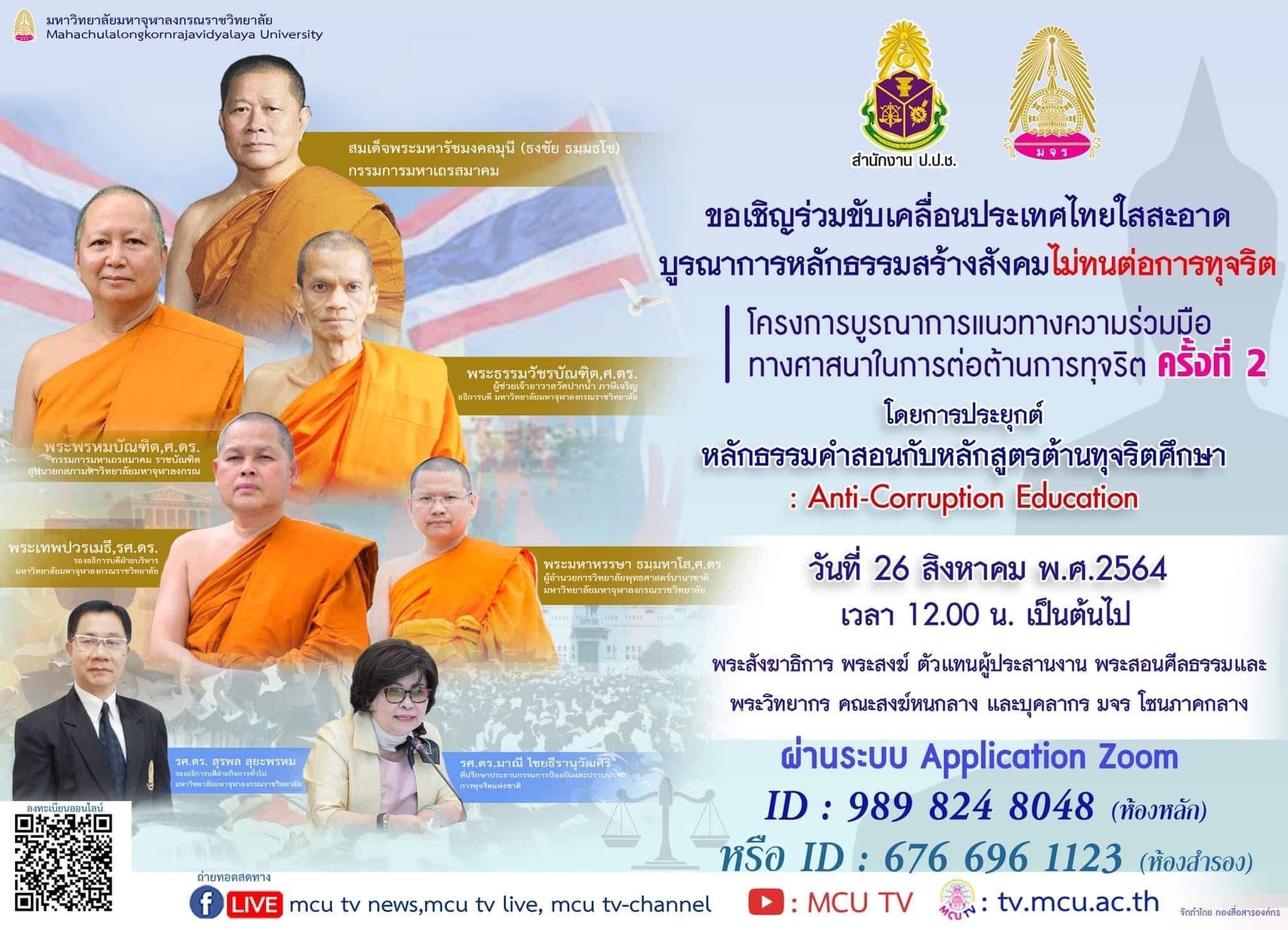 มหาวิทยาลัยมหาจุฬาลงกรณราชวิทยาลัย ขอเชิญร่วมขับเคลื่อนประเทศไทยใสสะอาดบูรณาการหลักธรรมสร้างสังคมไม่ทนต่อการทุจริต