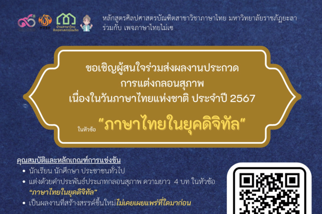 หลักสูตรศิลปศาสตรบัณฑิต สาขาวิชาภาษาไทย มหาวิทยาลัยราชภัฏยะลา ร่วมกับ เพจภาษาไทยไม่เซ ขอเชิญนักเรียน นักศึกษา ประชาชนทั่วไป หรือผู้สนใจ ร่วมส่งผลงานประกวดการแต่งกลอนสุภาพเนื่องในวันภาษาไทยแห่งชาติ ประจำปี 2567 ในหัวข้อ “ภาษาไทยในยุคดิจิทัล” จำนวน 4 บท