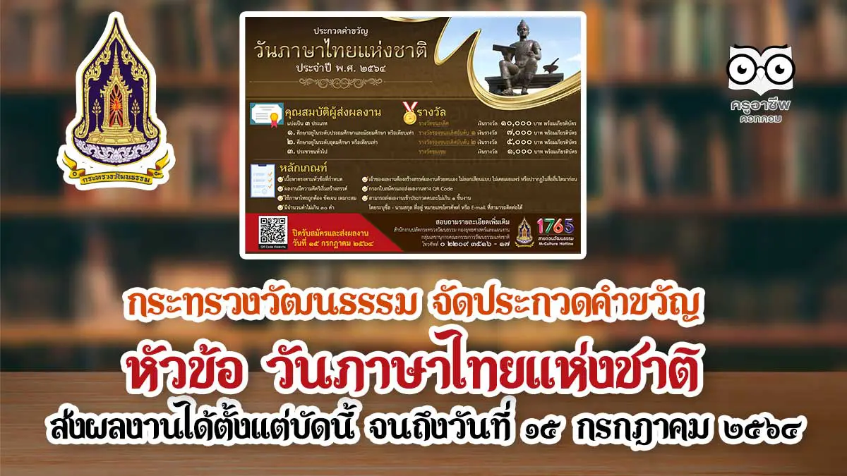 บทความนี้ ครูอาชีพดอทคอม มีกิจกรรมดี ๆ มาฝาก เนื่องในโอกาสวันภาษาไทยแห่งชาติ วันที่ ๑๔ กรกฎาคมของทุกปี โดยในปีนี้ กระทรวงวัฒนธรรม โดยสำนักงานปลัดกระทรวงวัฒนธรรม จัดประกวดคำขวัญ หัวข้อ “วันภาษาไทยแห่งชาติ” เพื่อรณรงค์ส่งเสริมให้นักเรียน นักศึกษา และประชาชน ตระหนักถึงคุณค่าและความสำคัญของภาษาไทย ซึ่งเป็นเอกลักษณ์และสมบัติวัฒนธรรมอันล้ำค่าของชาติ ตลอดจนมีส่วนร่วมในการแสดงทักษะความรู้ความสามารถด้านภาษาไทย เพื่อการสื่อสารความหมายอย่างชัดเจนและงดงามผ่านการประกวดคำขวัญ