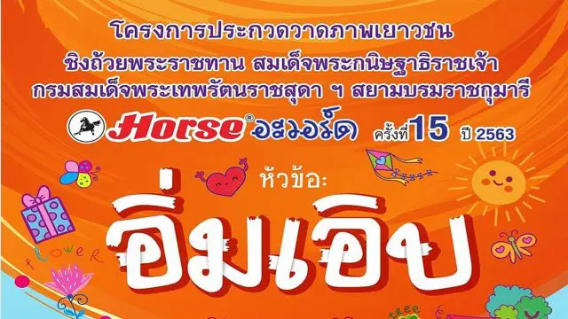 ประกวดวาดภาพเยาวชน HORSE อะวอร์ด ครั้งที่ 15 ประจำปี 2563 ส่งผลงานตั้งแต่วันนี้ – 25 ธันวาคม 2563 บริษัท นานมี จำกัด ได้จัดโครงการประกวดวาดภาพเยาวชน ชิงถ้วยพระราชทานสมเด็จพระกนิษฐาธิราชเจ้า กรมสมเด็จพระเทพรัตนราชสุดาฯ สยามบรมราชกุมารี ฮอร์ส อะวอร์ด ครั้งที่ 15 ประจำปี 2563 ในหัวข้อ “อิ่มเอิบ” เพื่อเชิญชวนเด็กและเยาวชนไทยร่วมรังสรรค์ผลงานศิลปะผ่านภาพวาดถ่ายทอดความรู้สึกถึงความสุข ความสดชื่น ความปลื้มปิติ