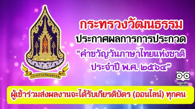 กระทรวงวัฒนธรรม ประกาศผลการประกวดคำขวัญ วันภาษาไทยแห่งชาติ ประจำปี พ.ศ. ๒๕๖๔ ผู้เข้าร่วมส่งผลงานจะได้รับเกียรติบัตร (ออนไลน์) ทุกคน