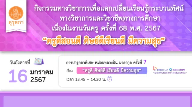 มาแล้ว กิจกรรมออนไลน์ เนื่องในวันครู ครั้งที่ 68 พ.ศ. 2567 คุรุสภาขอเชิญร่วมกิจกรรมทางวิชาการเพื่อแลกเปลี่ยนเรียนรู้กระบวนทัศน์ทางวิชาการและวิชาชีพทางการศึกษา เนื่องในงานวันครู ครั้งที่ 68 พ.ศ. 2567 “ครูดีสอนดี ศิษย์ดีเรียนดี มีความสุข” วันครู 2567 ระหว่างวันที่ 11 – 16 มกราคม พ.ศ. 2567 กำหนดการจัดงานวันครู ครั้งที่ 68 พ.ศ. 2567 วันที่ 16 มกราคม 2567 “ครูดีสอนดี ศิษย์ดีเรียนดี มีความสุข” อบรมฟรี พร้อมรับเกียรติบัตรหลังอบรม และสามารถนำไปต่อใบประกอบวิชาชีพครูได้ สามารถลงทะเบียนได้ในลิงก์ด้านล่าง