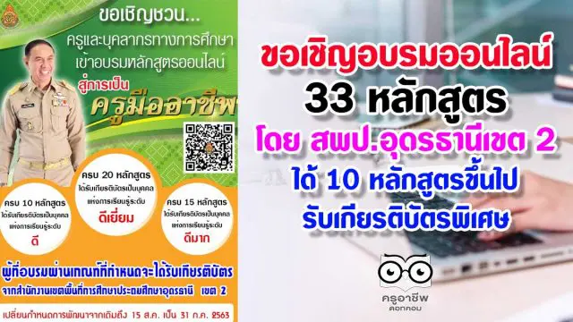 ขอเชิญอบรมออนไลน์ ทดสอบออนไลน์ โดย สพป.อุดรธานีเขต 2 รับเกียรติบัตรฟรี 33 หลักสูตร ได้ 10 หลักสูตรขึ้นไปรับเกียรติบัตรพิเศษ ขอเชิญข้าราชการครูและบุคลากรทางการศึกษาและบุคคลทั่วไปผู้ที่สนใจ ร่วมทำแบบทดสอบวัดความรู้เพื่อรายงานการพัฒนาตนเอง จำนวน 33 หลักสูตร โดย สำนักงานเขตพื้นที่การศึกษาประถมศึกษาอุดรธานี เขต 2