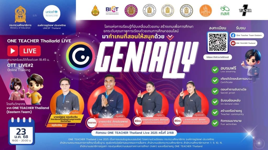 อบรมเชิงออนไลน์ ครั้งที่ 2 OTT LIVE หัวข้อ มาทำเกมที่สอนให้สนุก ด้วย Genially วันที่ 23 มกราคม 2568 รับเกียรติบัตรจากกระทรวงศึกษาธิการ และองค์การยูนิเชฟ ประเทศไทย